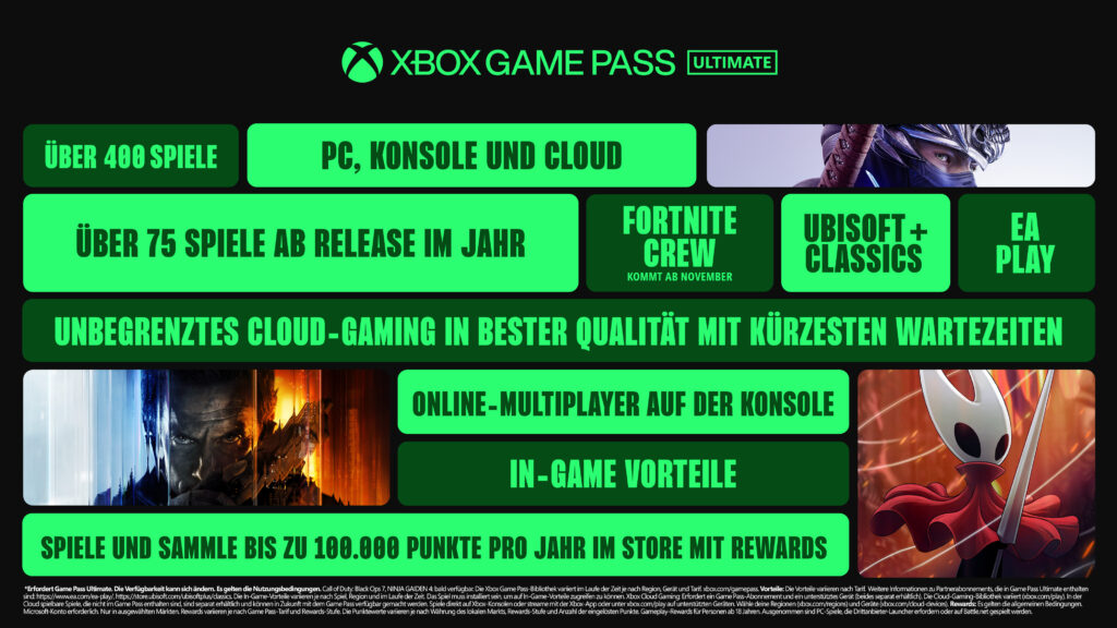 Jeder Plan beinhaltet erweiterte Spielebibliotheken, einschließlich PC-Spiele, unbegrenztes Cloud-Gaming, In-Game-Vorteile (einschließlich Riot Games-Titel) und ein überarbeitetes Rewards with Xbox-Erlebnis. Für Xbox Game Pass Ultimate-Mitglieder führen wir unser bisher umfangreichstes Upgrade ein, das mehr Spiele direkt zum Launch als je zuvor mitbringt, zum ersten Mal Fortnite Crew und Ubisoft+ Classics inkludiert, verbesserte Xbox Cloud Gaming-Streaming-Qualität mit bis zu 1440p und vieles mehr umfasst.